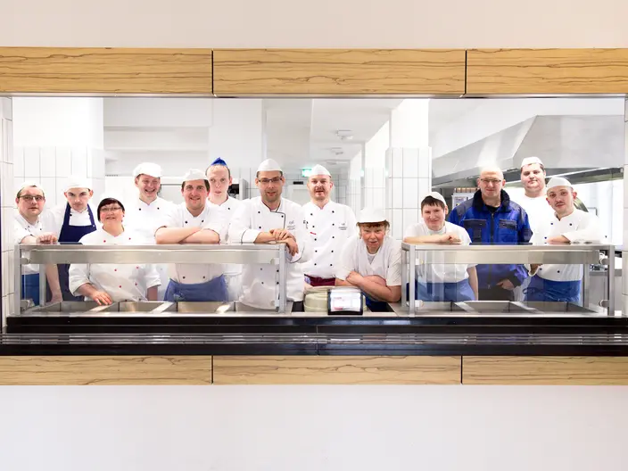 In der Großküche werden täglich bis zu 450 Portionen Gemeinschaftsverpflegung zubereitet. Ein Team aus Köchinnen und Köchen sowie Beschäftigten arbeitet dabei Hand in Hand, um Menschen mit Beeinträchtigung im beruflichen Alltag zu begleiten, ihre Fähigkeiten zu stärken und sie aktiv in die unterschiedlichen Arbeitsabläufe einzubeziehen. Darüber hinaus übernimmt die Küche die Bewirtung von Veranstaltungen und bietet Catering für private Feiern und externe Events an.