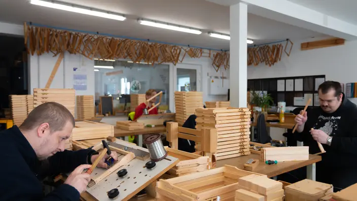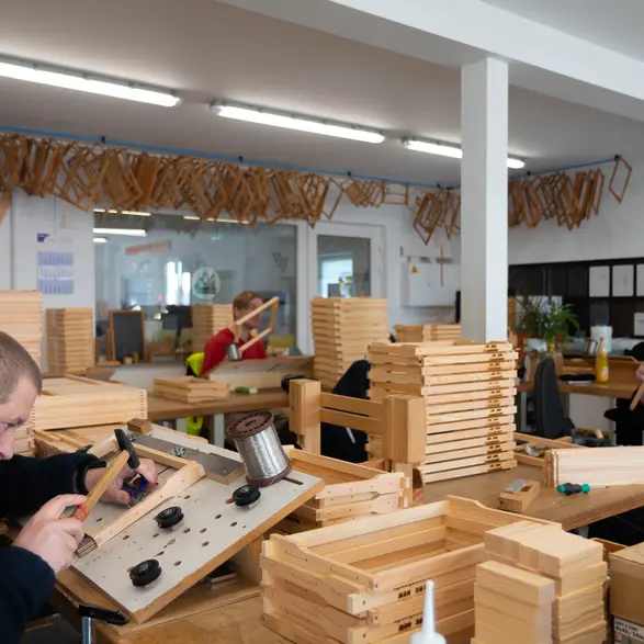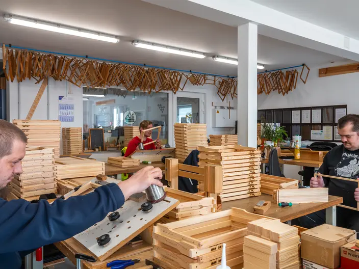 In der Tischlerei des CJD am Bartelskamp entstehen vielfältige Holzprodukte in sorgfältiger Handarbeit. Ein besonderer Schwerpunkt liegt auf der Herstellung von Bienenrahmen. Darüber hinaus fertigen die Teilnehmenden weitere Holzprodukte und können dabei ihre handwerklichen Fähigkeiten entwickeln und erweitern.
